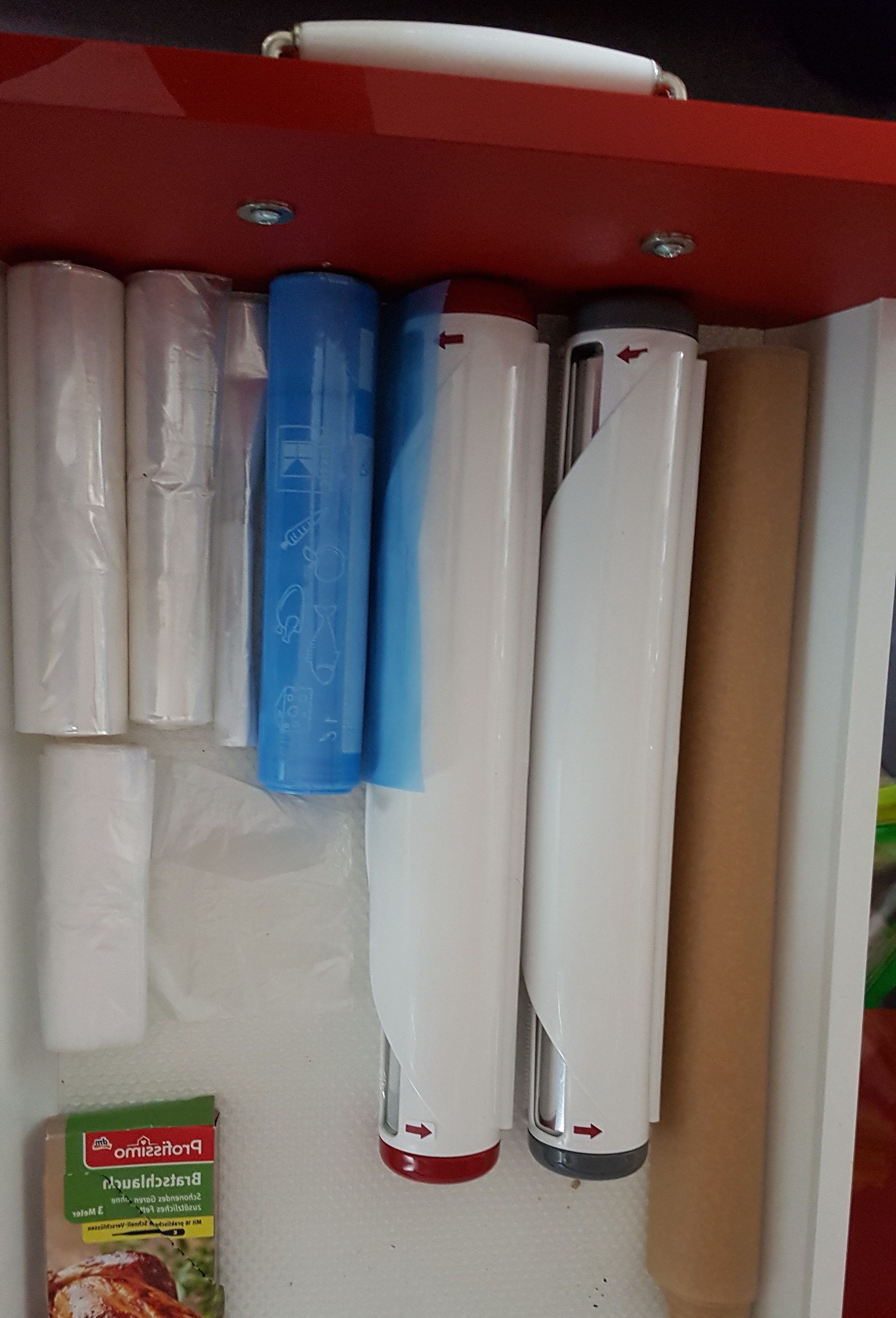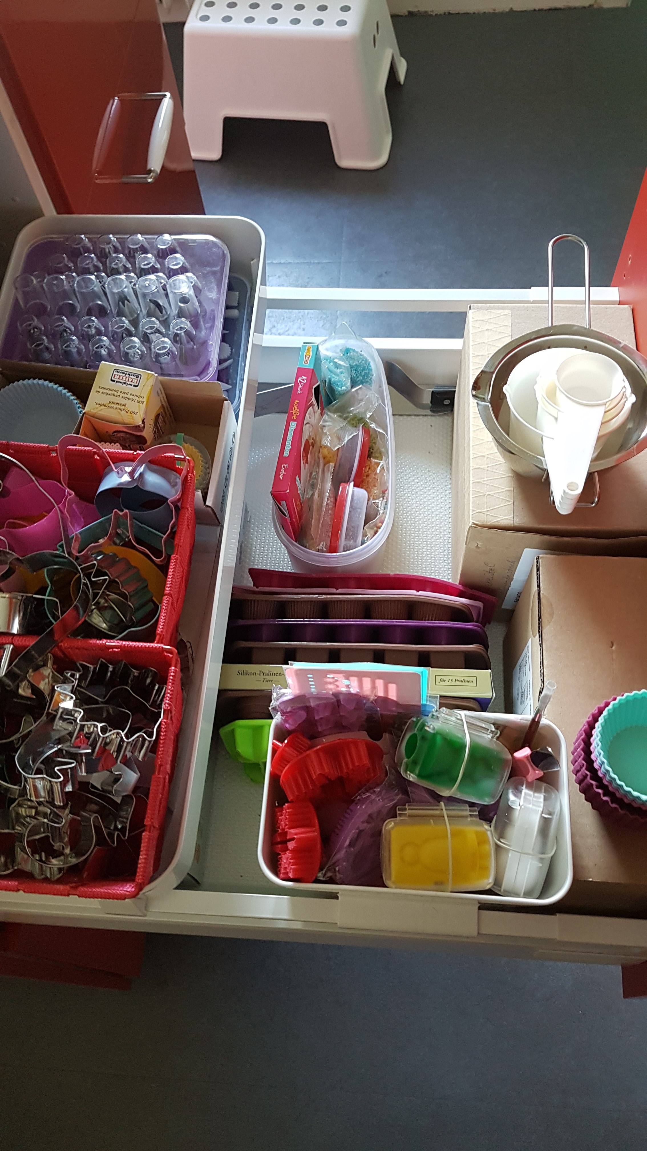 Weil mich das Chaos dort am meisten nervt, habe ich mit der Küche weiter gemacht. Es ist wirklich unfassbar, was sich für merkwürdige Gerätschaften ansammeln, die man niemals benutzt hat. Es flog viel raus und eine ganze Menge hat einen neuen, besseren Platz bekommen. Viele Abende saß ich mit Töpfen, Schüsseln, Plastikdosen und Kleinkram auf dem Küchenboden und sortierte. Und ich habe fleißig Fotos gemacht: